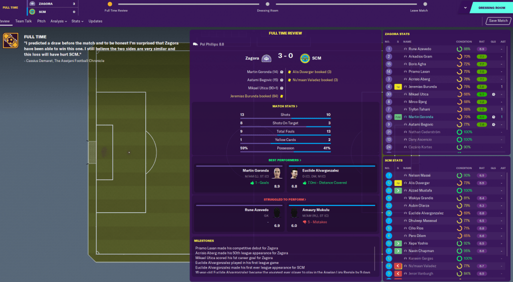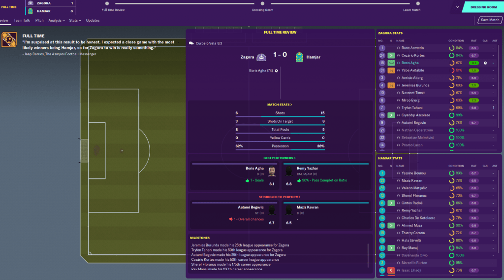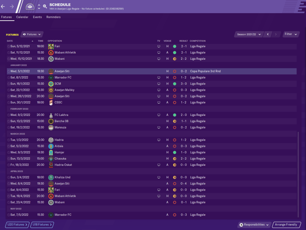 We then faced European football challenging Khaliza, led by Marcelo Bielsa, at home and earned a creditable 0-0 draw given they had 22 shots to our 9. That edged us 5 points clear, which was lucky because the next one was Aswijan Siti away and they promptly hammered us 4-0.