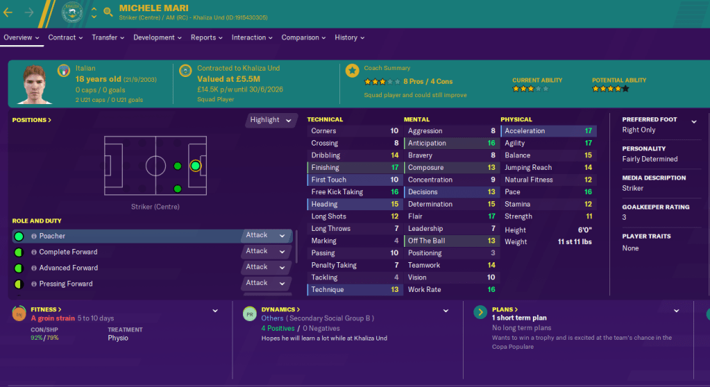 A couple of young prospects also arrived, of which the pick is absolutely 18-year-old Italian striker Michele Mari, who only cost us £3.7 million from Milan, who signed him for £5 million from Napoli 12 months ago. This kid looks special – 17 finishing, flair and acceleration, 16 pace and work rate, 15 heading is my kind of striker.