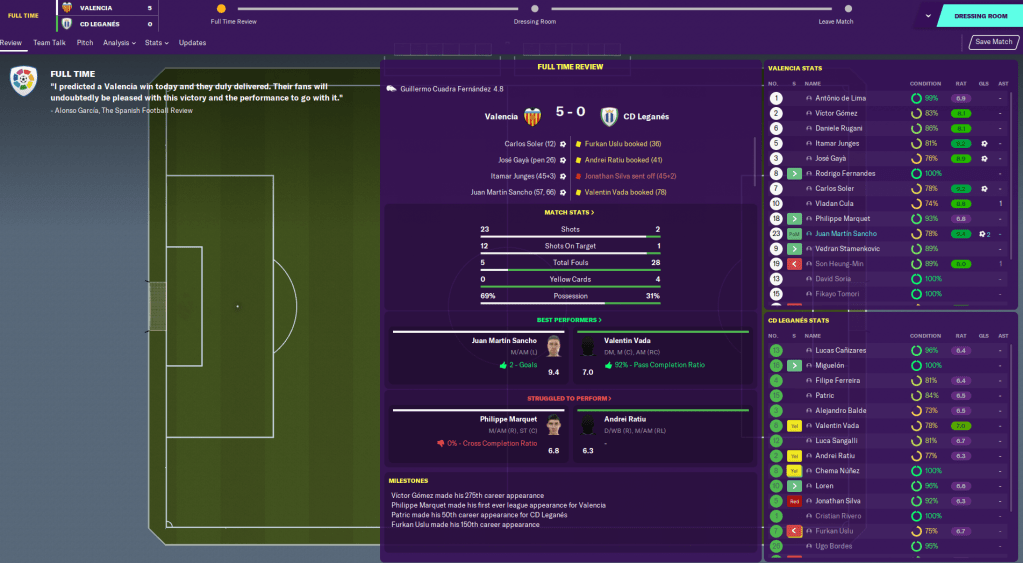 We followed that up with our biggest win as Valencia boss thanks to a 5-0 thrashing of Leganes. Captain Carlos Soler got things started with a delicious curled effort, Gaya won and scored a penalty, then Leganes had a man sent off and Junges curled home the following free-kick. Sancho, starting in place of the injured Unuvar, continued his growth with two goals in the second half.