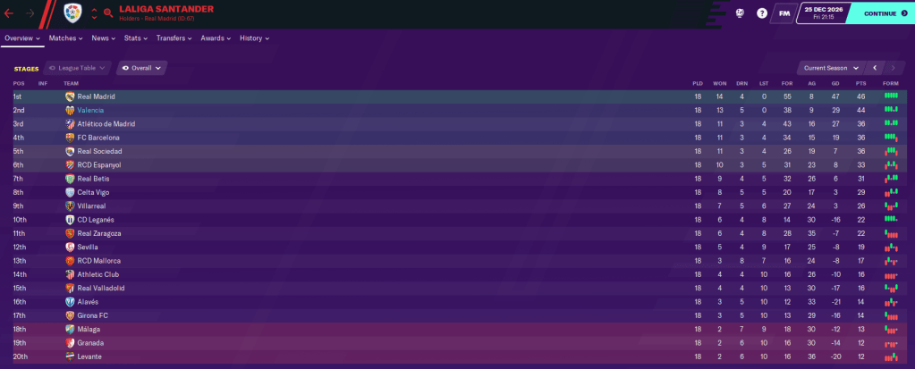 We drew 0-0 with Celta, then Son was back on it as he scored both goals in a 2-0 win at Sevilla, who are way down in 12th in La Liga. And that took us to the end of 2026 unbeaten after 18 matches but still sitting 2nd in the league, only 2 points behind Real Madrid. Real are also unbeaten and are just ridiculous, scoring more than 3 goals per match!