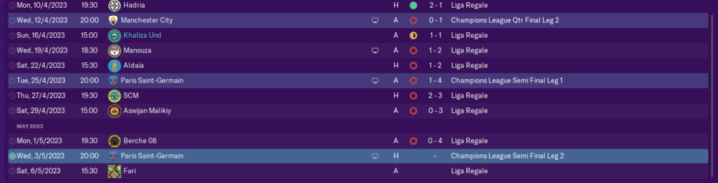 Aswijan Siti somehow managed to make a mess of their mass of games in hand, losing 5 straight Liga Regale matches. That guaranteed we would finish in at least 5th, and that ensured we would be playing in the Europa League next season! I’m not sure what happened to Siti, but I presume their players were knackered because they played 6 matches in 16 days – 3 of which were on 25, 27 and 28 April.