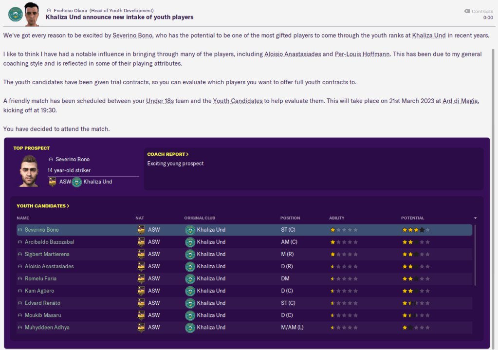 We then got some decent news with our latest youth intake, from which 14-year-old striker Severino Bono looks an alright player. The rest didn’t look too hot but we did get the brillantly named Kam Aguero and the star man of the Youth Candidates match with 2 assists was midfielder Arcibaldo Bazazobal.