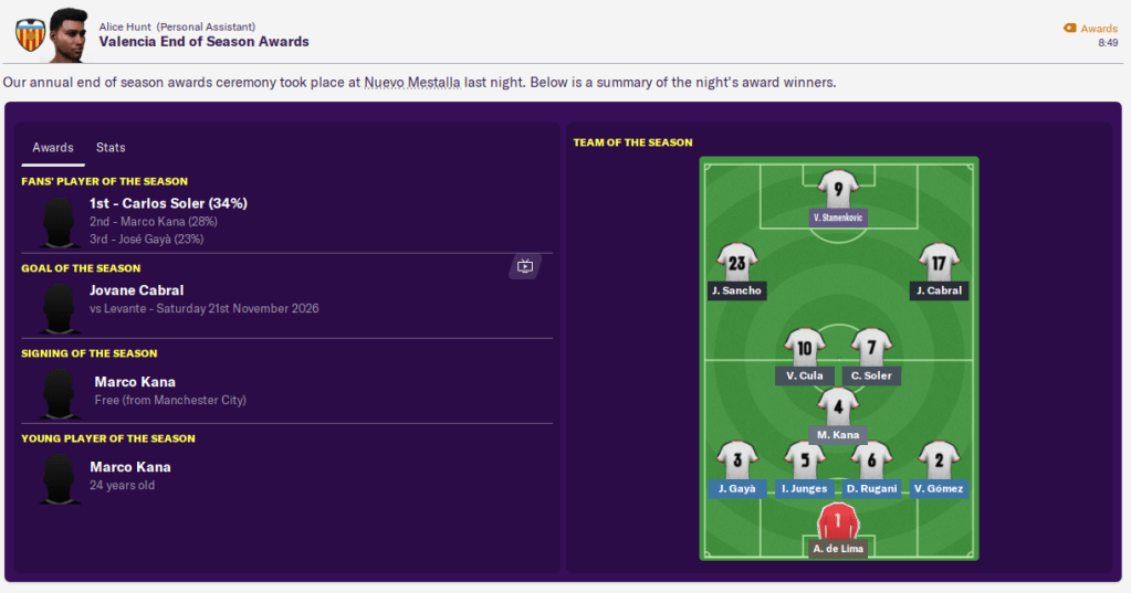 Interestingly, Carlos Soler won the fans’ player of the season with 34% of their vote, ahead of Kana (28%) and Gaya (23%). Kana was of course signing of the season, seeing as we got him on a free from Man City, and the young player of the season (although at 24, that seems a bit dubious).