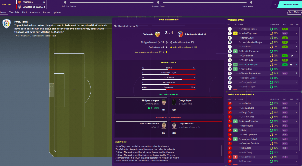 We opened the season at home to Atletico Madrid and Marquet scored two identical goals in the 14th and 24th minutes – both back-post headers from left-wing crosses. He also laid on Carlos Soler to score a screamer that rounded out an impressive 3-1 opening day win.