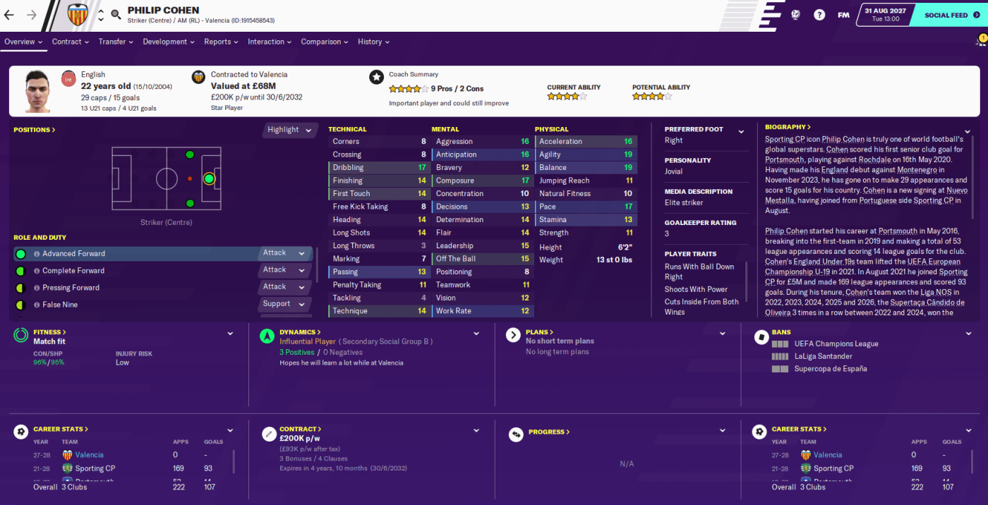 But the big news this summer was Jovane Cabral attracting a load of interest with 12 months remaining on his contract. And, after I’d rejected a couple of offers, he decided he wanted to leave my club for the second time in this save. We eventually managed to get £50 million for him from Arsenal, which is by far the biggest sale so far in this save – both with Sporting and Valencia. Good riddance, Jovane.