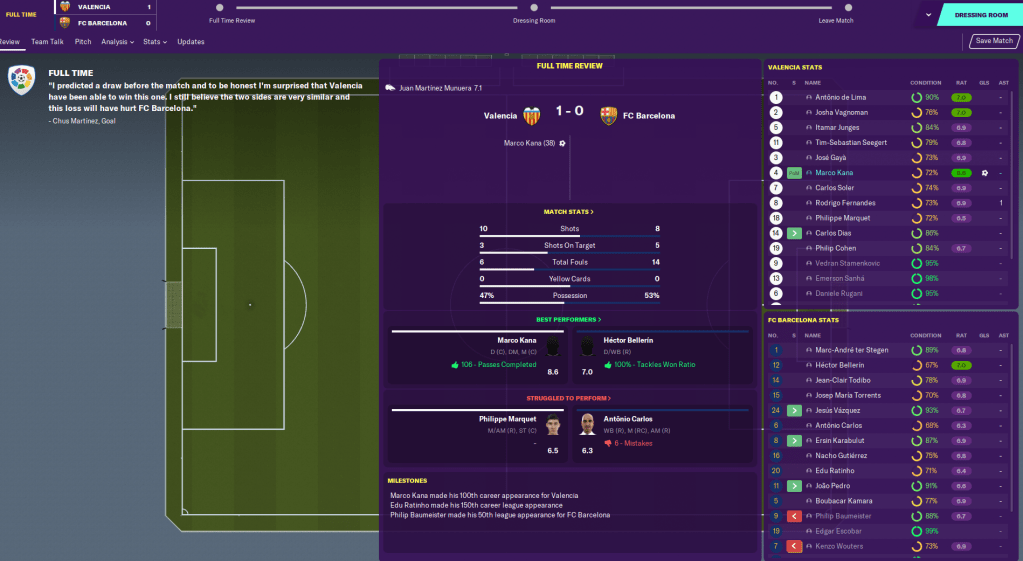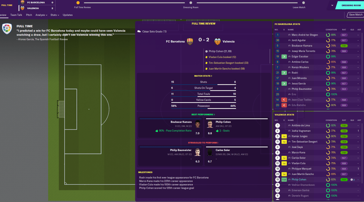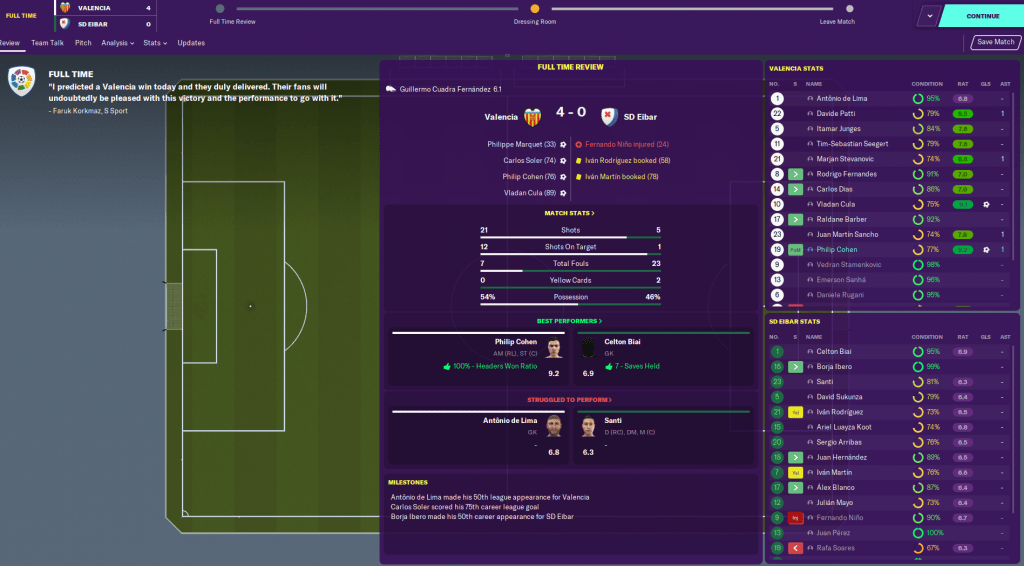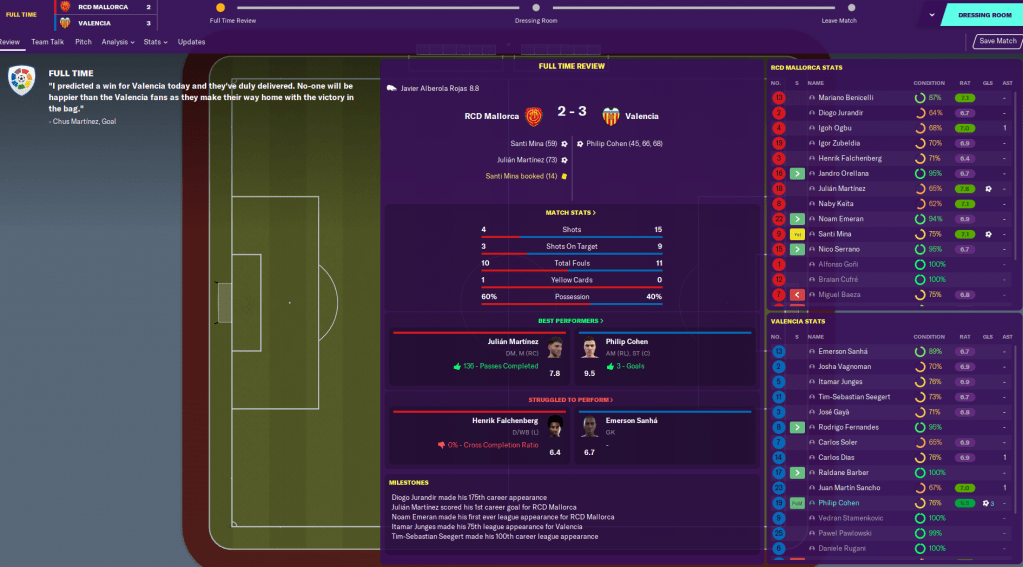 After a nice break or Christmas, the Valencia chicos kept the good times rolling as 2028 came around. We dominated at home to Celta, going two ahead through Cohen and Dias and remained comfortable as they got one back in the second half. Then we dominated again in a 2-0 win at home to Girona thanks to two goals in three minutes by Marquet and Cohen at the end of the first half.