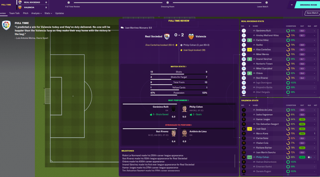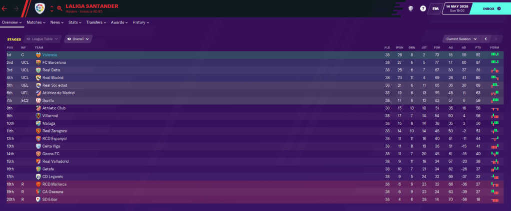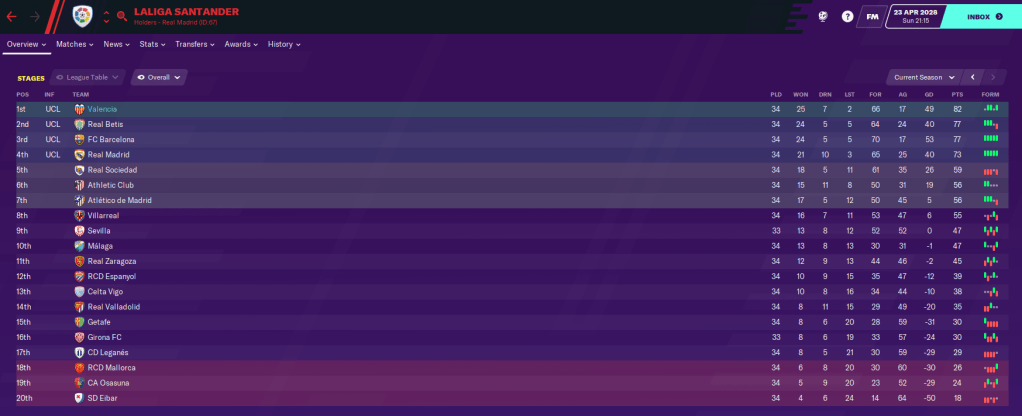 Cohen scored to earn a 1-1 draw with Espanyol then we finished the season at home to Real Madrid on my 44th birthday (14 May). I’m suddenly very old in FM world.