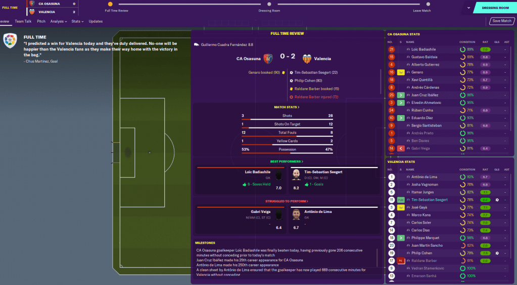 Another away day followed as we headed to Osasuna. Centre-back Tim-Sebastian Seegert – who shirt number purists will hate because he’s wearing 11 – picked a great time to nod home his first Valencia goal on 22 minutes. Then that man Cohen stepped up to make sure of the result in the second half.
