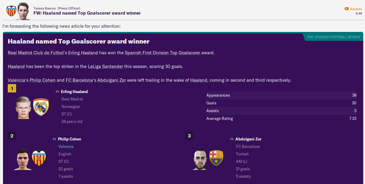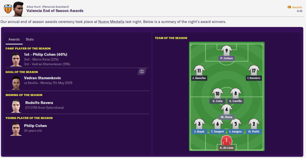 Vedran Stamenkovic’s fine form earned him the Spanish Young Player of the Year award. While Kana finished second in the League Player of the Year award and Cohen finished second to Erling Haaland as Top Goalscorer. de Lima won Goalkeeper of the Year and I won Manager of the Year.