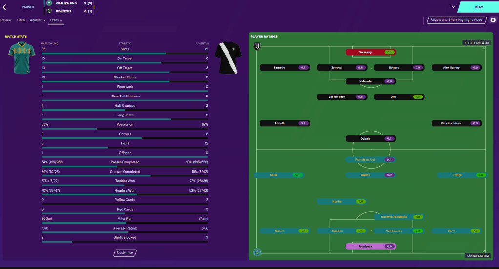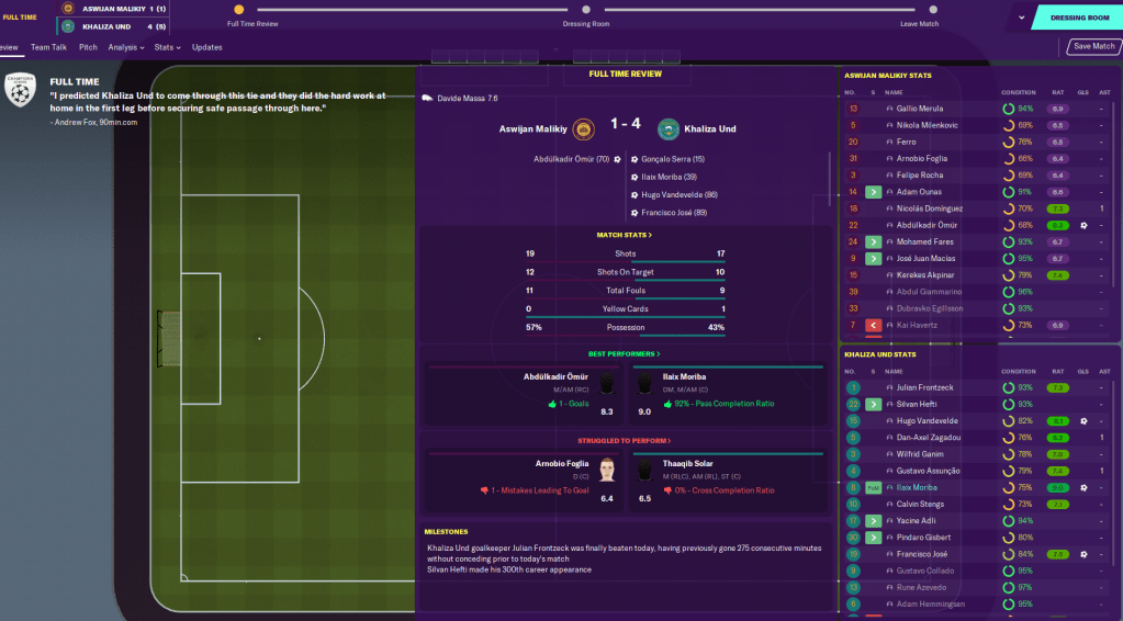 That big win was immediately followed by the first leg of a Champions League quarter-final with Malikiy, with the home leg up first. This time we absolutely dominated the game and took a deserved lead with another special solo goal by our 100% scout recommended Francisco José. However, we were a little wasteful with chances and failed to add to that lead but importantly also didn’t concede.