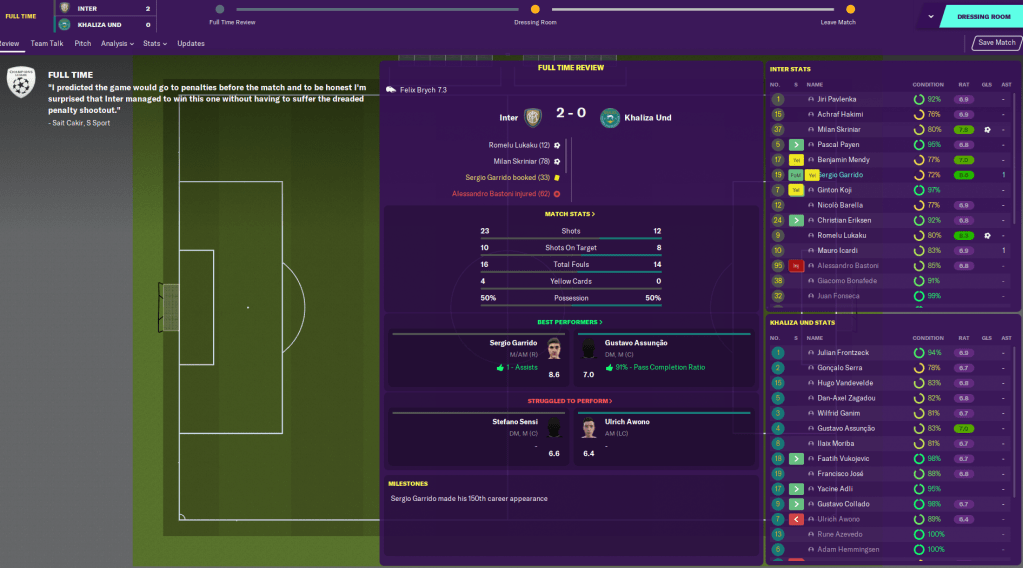 We were just about favourites for the big game at 6/4 compared to Inter at 13/8, in what was the first ever meeting between the two sides. But Inter’s team hasn’t really changed in the six years of this save, with the likes of Mauro Icardi, Romelu Lukaku, Christian Eriksen, Milan Skriniar and Nicolo Barella.
