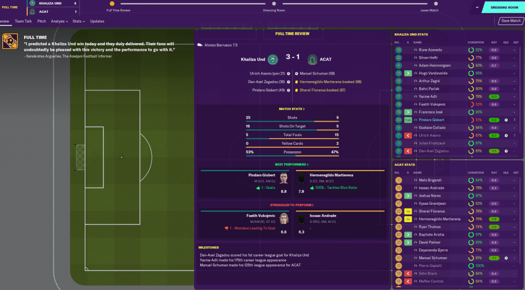 A home clash with ACAT sandwiched the two Malikiy matches and our players were knackered, so I did a heavy rotation for the league game. But the two regular starters we did retain had us 2-0 up at half-time with an Ulrich Awono penalty and a header by Dan-Axel Zagadou. Young winger Pindaro Gisbert added a third before ACAT pulled one back. And this win put us one point away from the title.