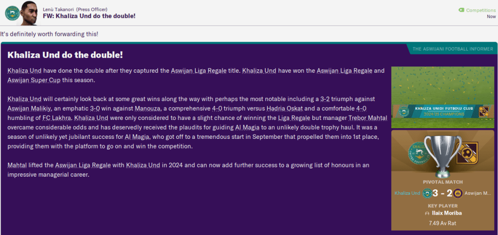 Despite that final loss, I’m really enjoying managing the Khaliza side and I think it’s right up there with the best teams I’ve managed on FM, alongside my Atalanta side of FM 2019. We have a great young team that’s really exciting to manage and I’m intrigued to see how good they can become.