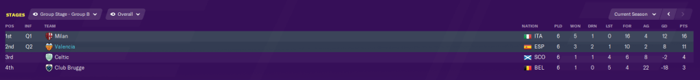 We got started at Club Brugge and did so very well with a 5-0 win in which all four scorers got their first goals of the season. Academy product left-back Juan Carlos got us started then Seegert, a Gutiérrez brace and a Carrillo long ranger. Then we beat Celtic 1-0 way thanks to Cohen’s second-half goal. A 0-0 draw at home to Milan had us in a relatively strong position, despite them demolishing us at San Siro.