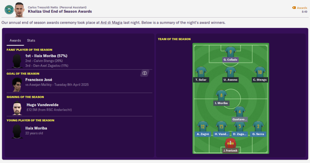 Join us next time as we move into the 2025/26 campaign looking to defend our title as champions of Aswijan for the second time. And I’m expecting a much tougher challenge from Aswijan Malikiy, who’ve just sacked their manager of 12 years.