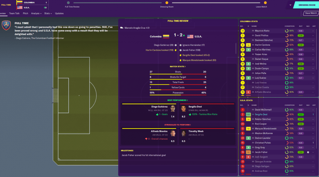 I went to a defensive formation and we held out for a 1-1 draw. Then I threw on a second left-back to provide more cover and tried to hit them on the break. And it somehow paid off as Dest’s cross picked out substitute striker Jacob Fisher to head home his first goal for the USA. Great timing, Jacob.