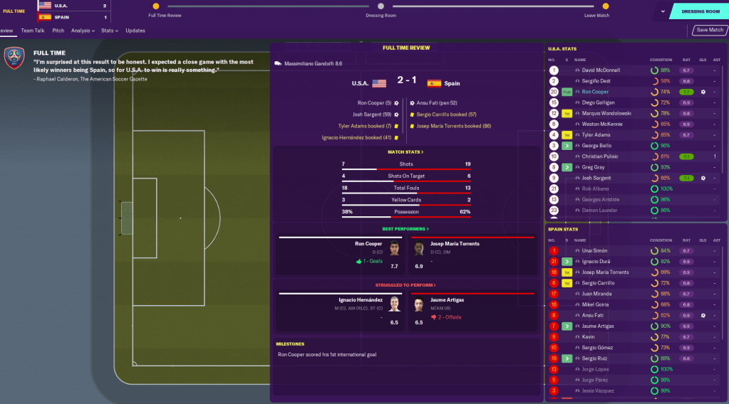 I kept things as they were until 80 minutes when I brought on another left-back for winger Timothy Weah and we went on big time-wasting efforts. I thought the ref was trying to give another penalty to Spain for who-knows-what but thankfully VAR said it was outside the box. But in reality, Spain offered very little, with only 19 shots to our 7, and we held on for a famous victory!