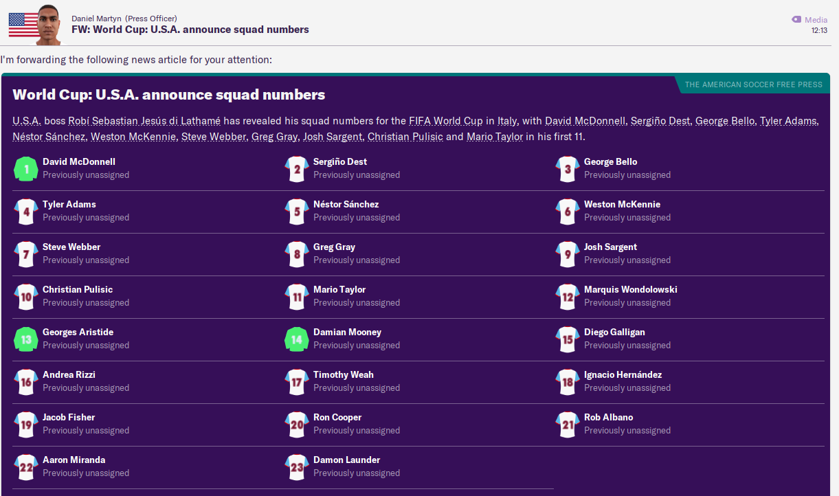 We ultimately fell 1-0 to hosts Italy, which was a highly respectable effort. Luckily, the US FA agreed and were delighted with our performance at the World Cup.