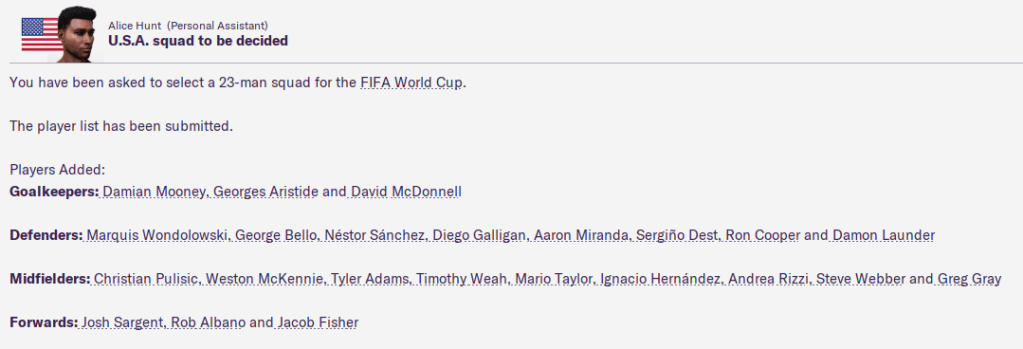That brings our time with the USA to an end, as I don’t think we can take the side any further than the World Cup quarter-finals. But stay tuned for our next career move shortly!