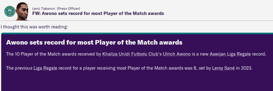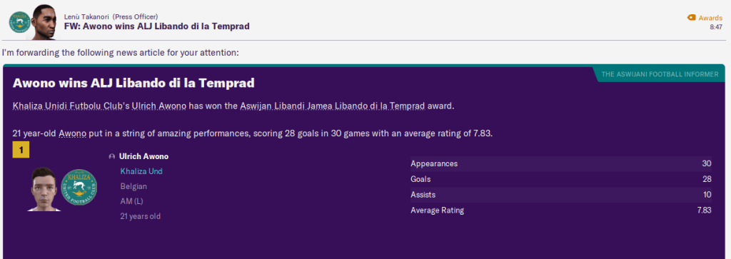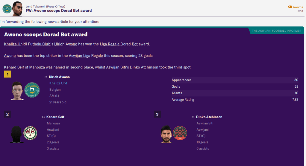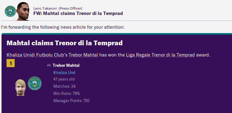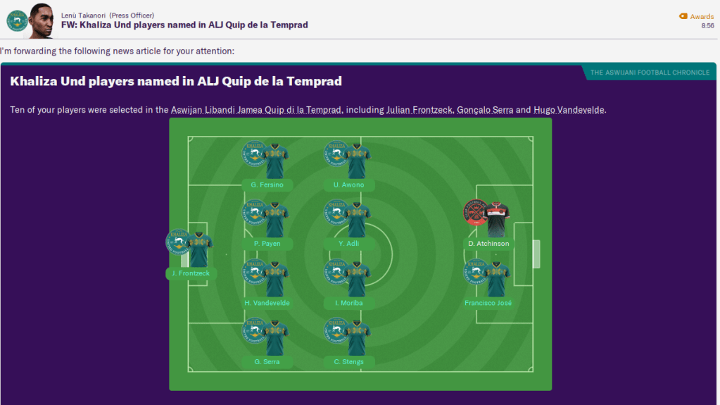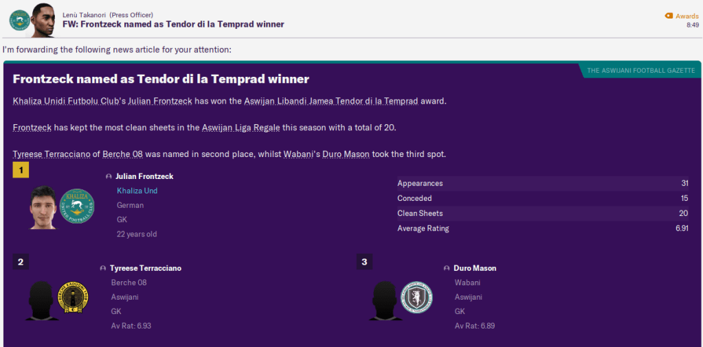 Julian Frontzeck also won Tendor di la Temprad (goalkeeper of the year) and I won Trenor di la Temprad (manager of the year) for the 3rd year in a row. While 10 of our players were named in the Liga Regale Quip di la Temprad (team of the year), with the only non-Khaliza player being Aswijan Siti’s Dinko Atchison.