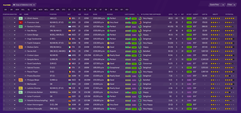 Moriba was hugely impressive with a ridiculous 7.60 average rating from 47 appearances – only bettered, of course, by Awono – while his midfield partner Adli averaged 7.53 from 52 matches. And that justifies my decision to ditch the holding midfielder and play both Adli and Moriba in playmaking roles.
