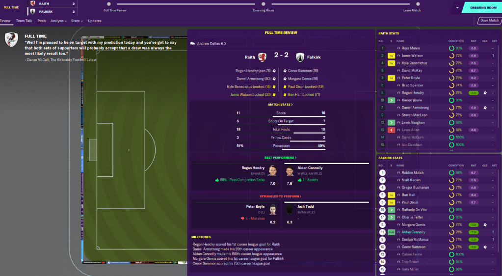 A first v second battle then ensued as we welcomed Falkirk to town. They raced into a 2-0 lead through Connor Sammon’s 14th goal of the season and Morgaro Gomis. But I demanded more and went more attacking and the lads bounced back with two goals in three minutes from as both Hendry and young winger Daniel Armstrong scored their first goals for the club.