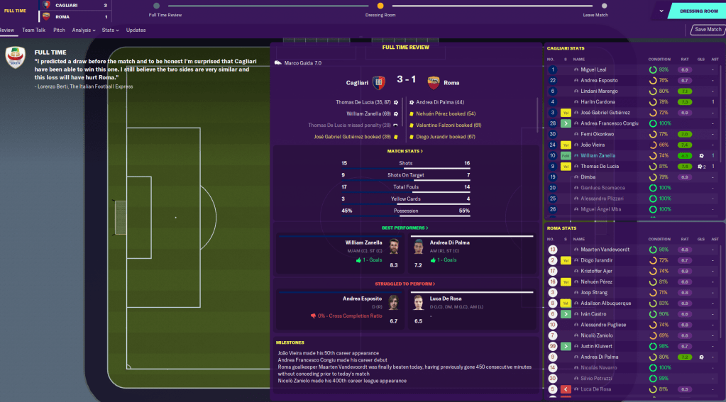 A repeat of my first game in charge of Cagliari saw us earn a respectable 1-1 draw at Sassuolo. Then two great finishes from Vieira and left-back José Gabriel Gutiérrez eased us past an inept Udinese side that didn’t even have a shot until the 83rd minute. Our unbeaten start came to an end as we were unlucky with a harsh penalty that resulted in a 1-0 loss at Genoa.