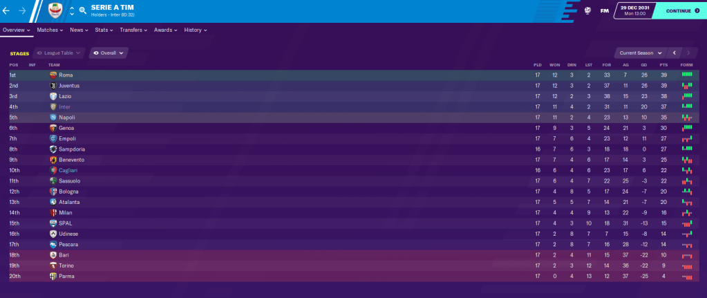 That left us in 7th, just behind Inter in the league. But interestingly, Milan are next to bottom of the league and sacked manager Jorge Sampaoli in early October.