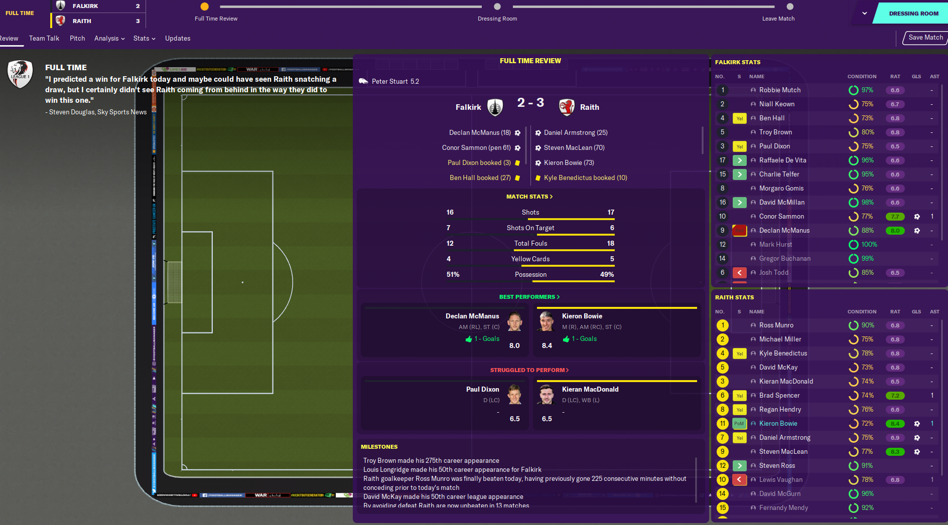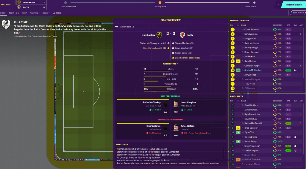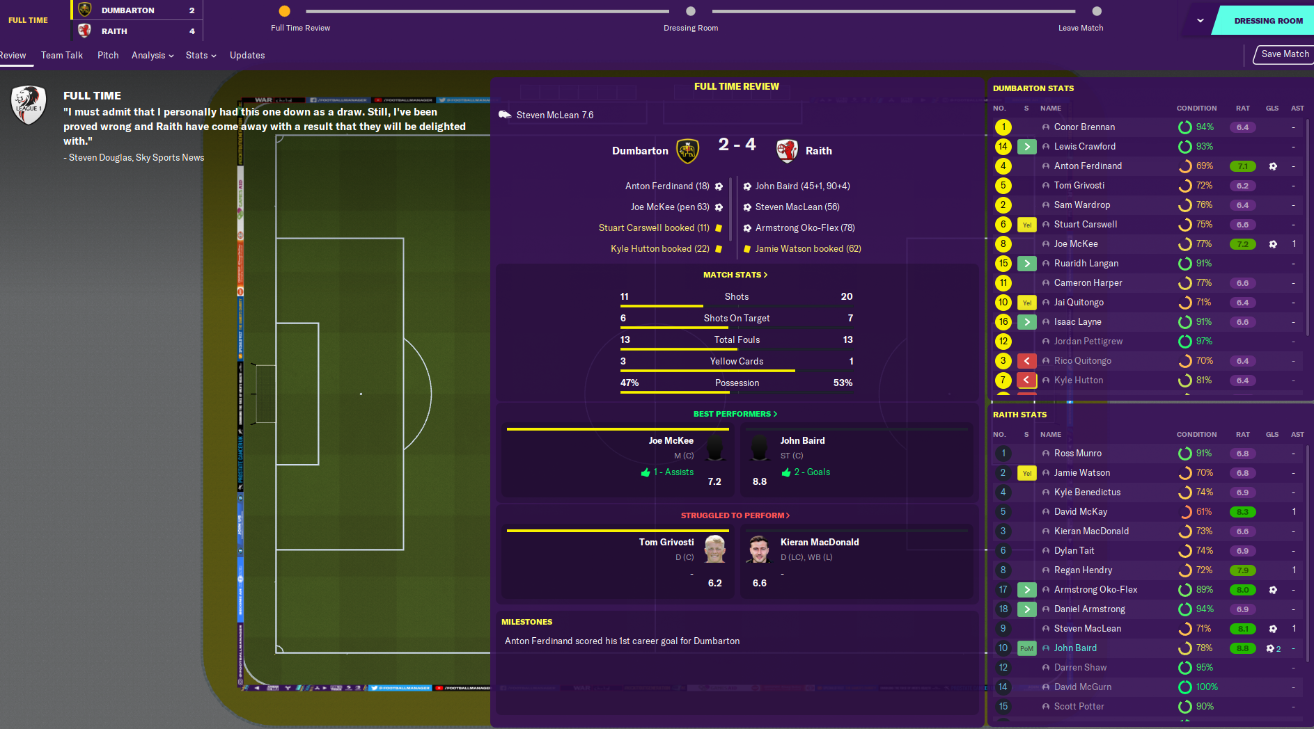 And we fell behind again as local rivals East Fife came to town, but this time we bounced back with another McKay goal. Two substitutions then made all the difference as I switched both wingers and replacements Armstrong Oko-Flex and Simon Brady both scored before striker John Baird ended an 11 hour goal drought. But midfielder Hendry was the star of the show with 2 assists and 6 key passes.