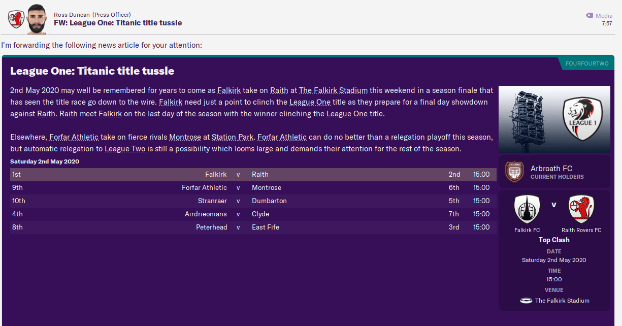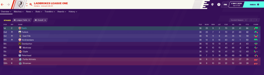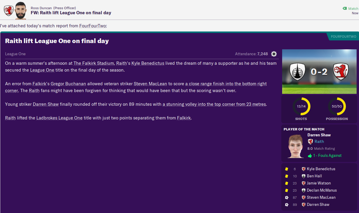 The match looked to be dragging towards a 0-0 that would see Falkirk seal the title but it turned, again, on key substitutes. I brought on young winger Brady and striker Darren Shaw on 79 minutes. And 8 minutes later, Brady knocked a nice cross into the box that MacLean converted at the near post. That looked to have won it but then 2 minutes later, Brady played a delicious through-ball for Shaw to race onto and slam home his first senior goal. And what a time to score it!