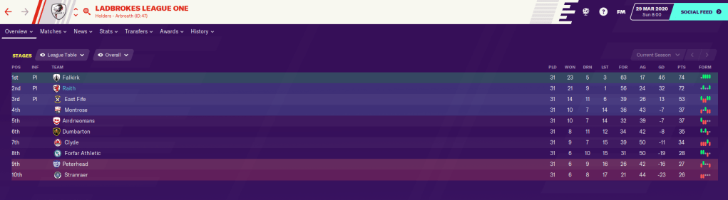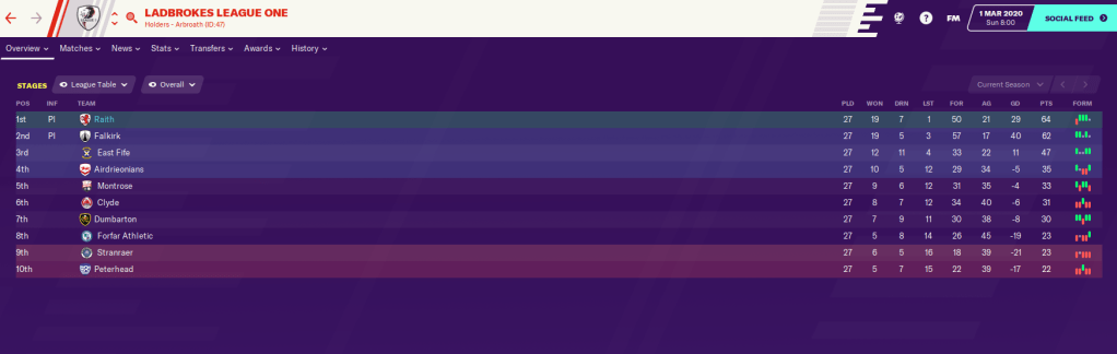 That took us into a top of the table clash with Falkirk, which turned out to be a dull affair that ended 0-0. That point earned us and Falkirk a playoff spot in March with 9 games remaining, while we were 2 points clear in the race for the title and sole automatic promotion place.
