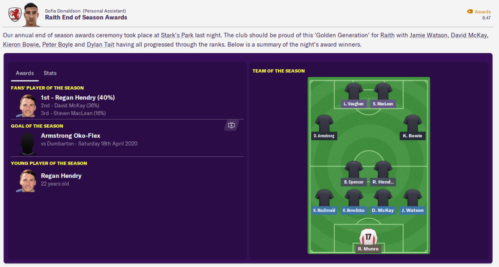 Hendry rightfully won the Raith fans’ player of the season with 40% of the vote, followed by McKay (36%) and MacLean (18%). Hendry was also young player of the season, while Celtic loanee Armstrong Oko-Flex won goal of the season.