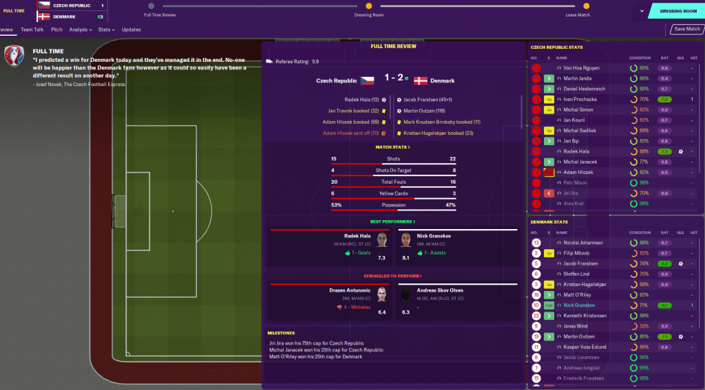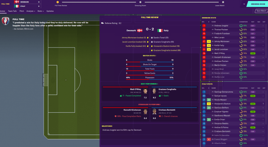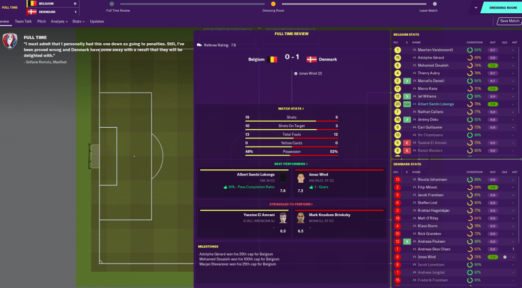 I immediately regretted us throwing the Italy game, as they were drawn with Iceland while we got Belgium. I went to a more defensive formation and brought Matt O’Riley in to strengthen up the midfield in the aim of nullifying Belgium’s strong attack.