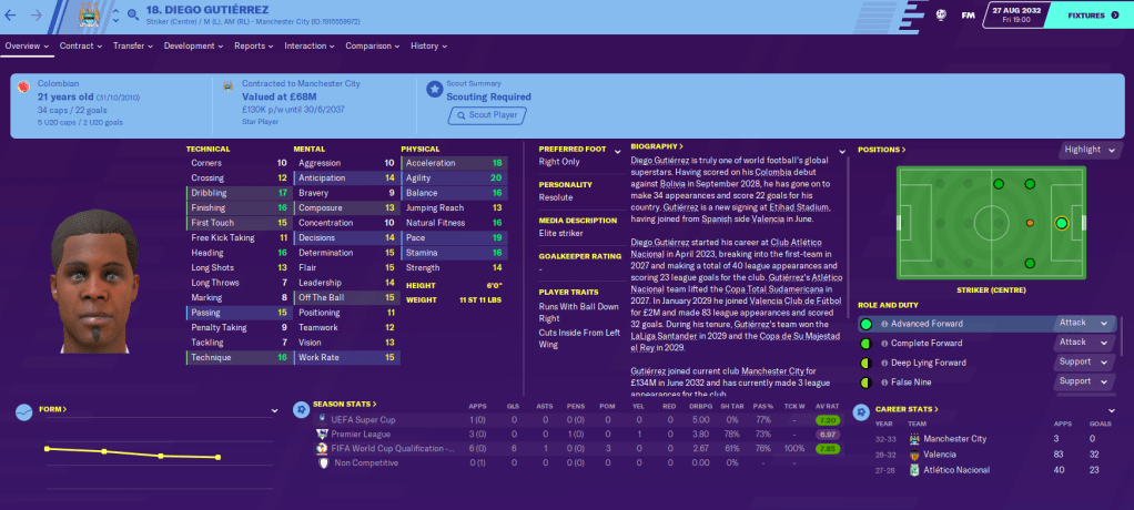 In other news, the biggest transfer of the summer saw Manchester City sign my former striker Diego Guitérrez, who I signed for £5 million, from Valencia for £134 million! And you’ll see he’s gone pretty incredible!