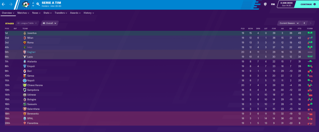 That meant going from 10th then 8th in the last 2 seasons to finishing in the top four without adding to our bank balance of £30 million to bolster our 17 first-team players. Which seems totally ridiculous! Furthermore, my contract expires at the end of the 2032/33 campaign, so I fully expect not to be in charge of Cagliari come the start of next season.