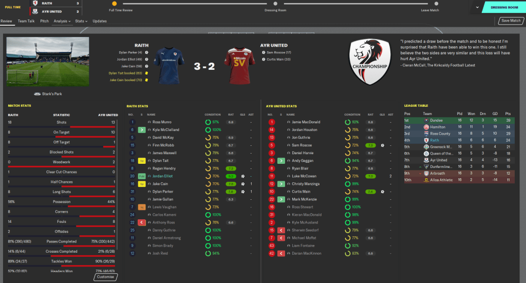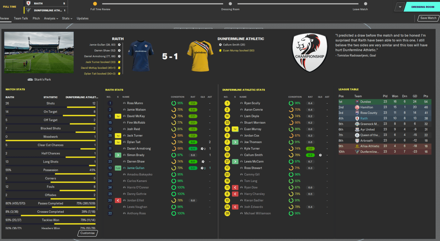 Our penultimate match of the regular season was at home to Ayr and Shaw got things started with his 20th goal of the campaign then Elliot sealed a 2-1 win. And we finished up at champions Dundee, so I rested loads of players for a game in which we “faced the impossible.” We held them to 1-1 until the last 20 minutes, when they ran riot to win 4-1.