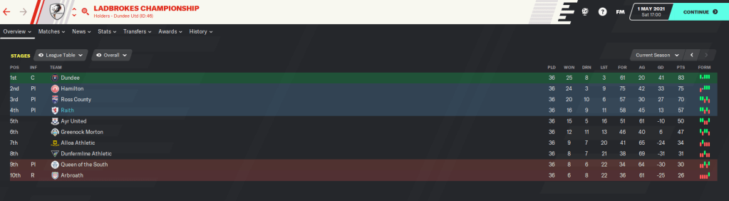 That took us into a two-legged playoff match against Ross County, of which the winner will face Hamilton. And I think the winner of that game then has a playoff game against the next-to-bottom team in the Premier League. So the chances of promotion via the playoffs are pretty slim!