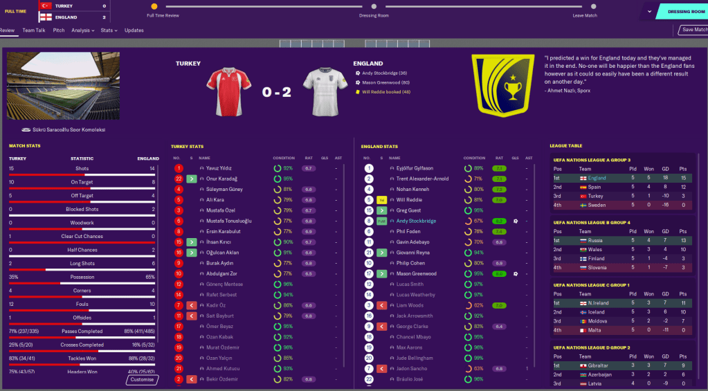 The good start continued as we went to Turkey and won 2-0 with goals from Stockbridge and an excellent free-kick by Greenwood, who replaced injured Pearson-Elsdon on the left. And we completed the group with a 100% record with a superb 3-1 win in Spain led by Cohen’s 43rd goal on the occasion of his 75th cap and a Sancho brace.