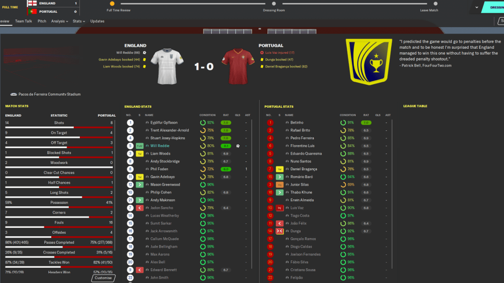 We took on 2026 world champions Portugal in the semi-final. They had a fairly ageing squad that included my former Sporting players Daniel Braganca and Eduardo Quaresma (34 and 31), Joao Felix and Florentino Luis (both 33) and Fabio Silva (30). A relatively dull game saw us dominate the chances and sneak through 1-0 with a goal by centre-back Will Reddie.