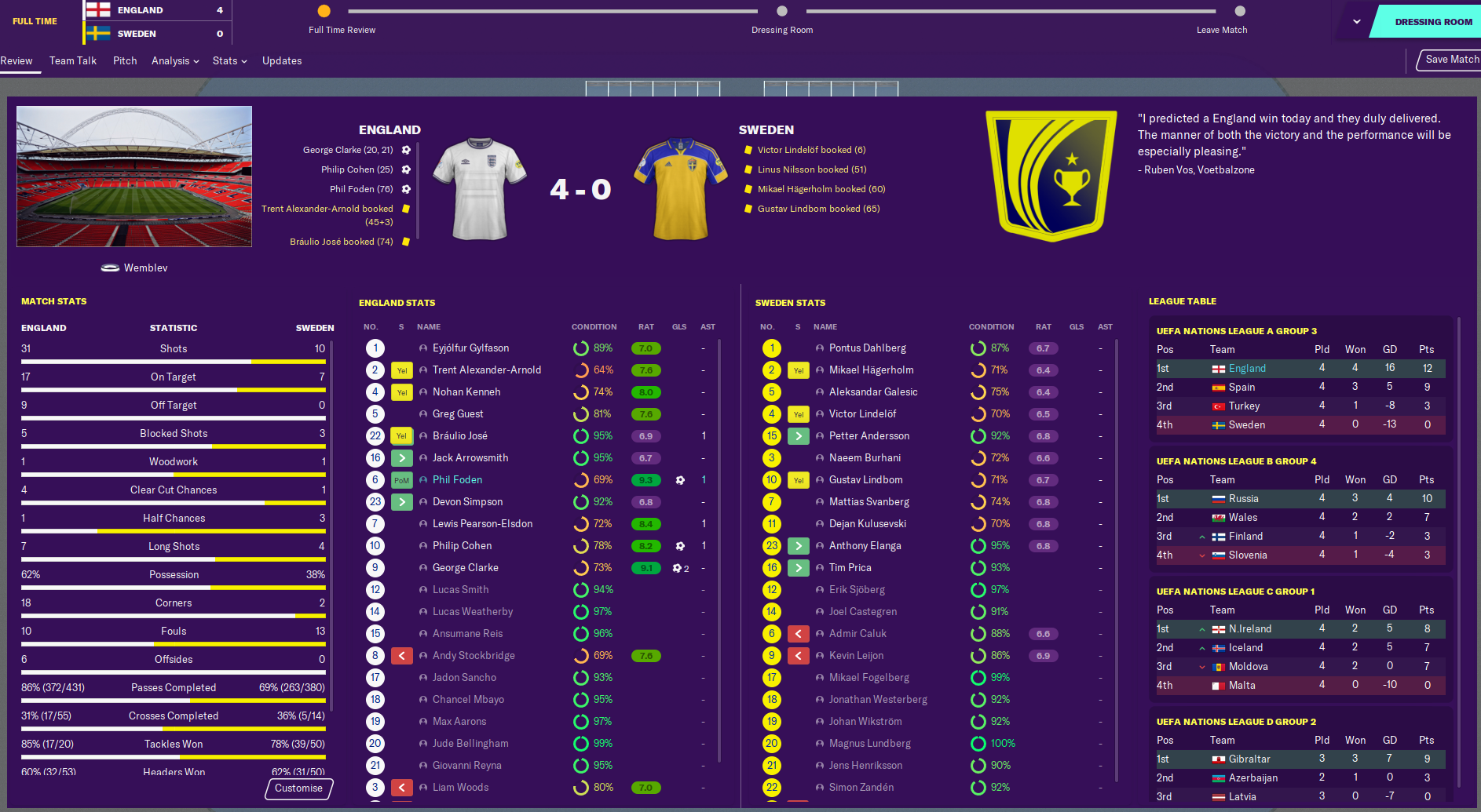 We then hammered Sweden 4-0 with a Clarke brace and a Cohen goal in 5 first-half minutes then another Foden screamer after the break.