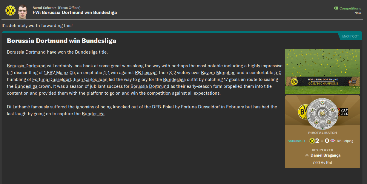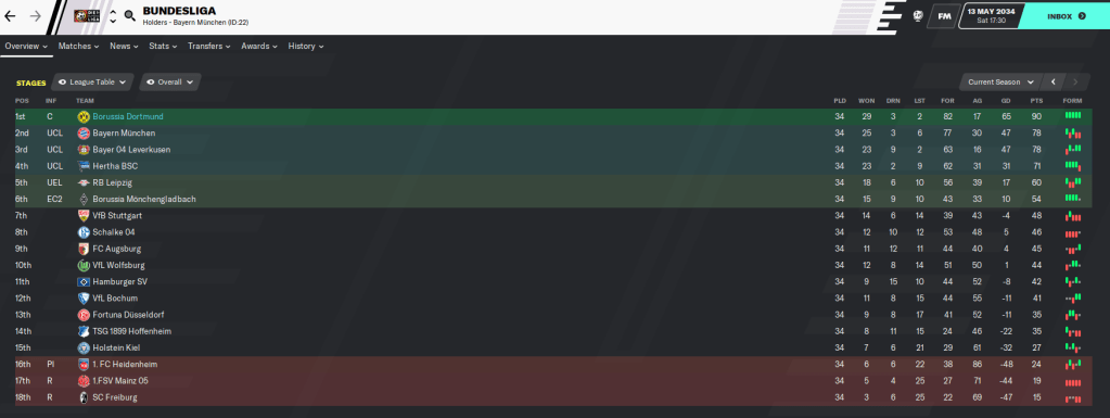 That wrapped up a first Bundesliga title in 3 years and the 13th in Dortmund’s history. It also earned us a massive £92.88 million in prize money! This also sees me win my 9th league title as a manager, which is a huge 9 behind the ridiculous 18 domestic titles of Pep Guardiola.