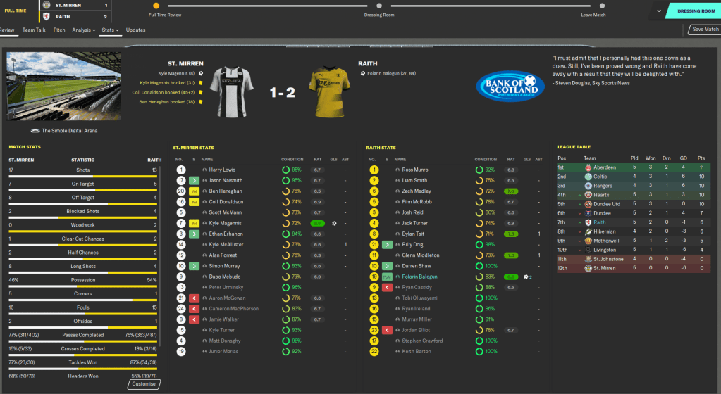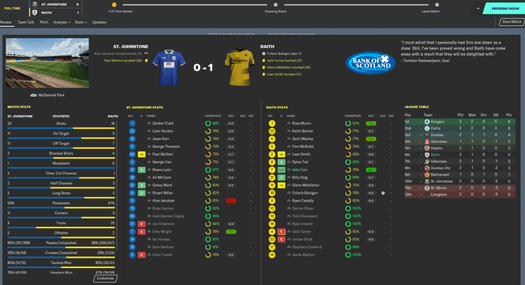 But we got our first Premiership win at St. Johnstone, who the media expect to be right in the relegation mix with us. The game didn’t start well as we gave away a penalty but Ross Munro went and saved it. Then 2 minutes later we were given a penalty of our own that Balogun smashed home down the middle. From there we survived a bit of a battering with 25 shots faced and Munro making 11 saves. But, how can a keeper make 11 saves, including a penalty, and only play a 7.2?