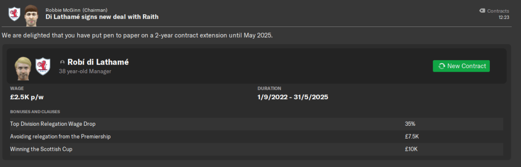 “Listen,” McGinn continued, “you know that the board is delighted with your work at the club last season, and that seems to be continuing this season. So before it becomes an issue with your deal expiring next summer, we wanted to kick off contract talks with you.” di Lathamé was a little taken aback but delighted by the news and immediately agreed to meet McGinn and the other board members at Stark’s Park for lunch and contract talks.