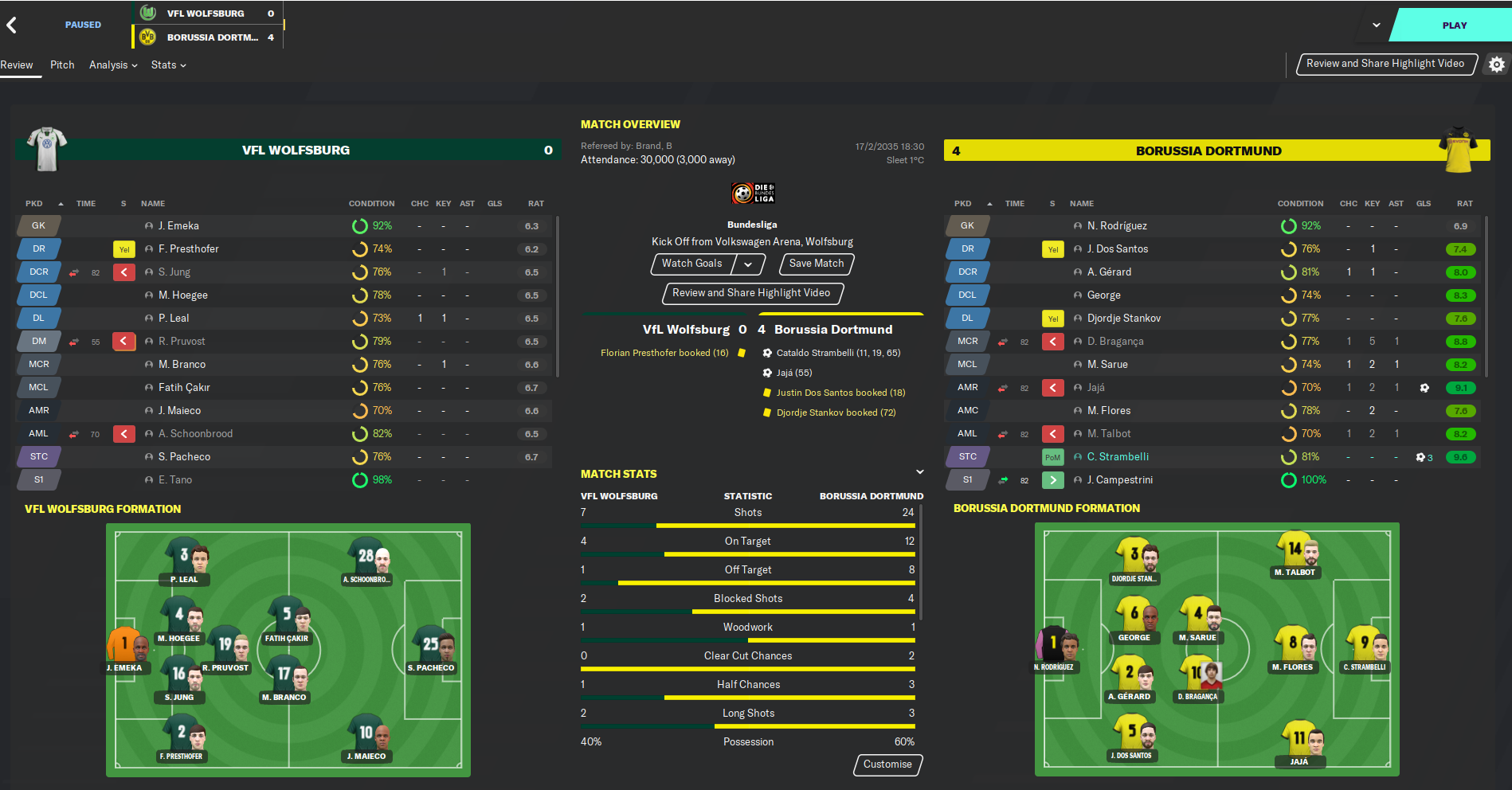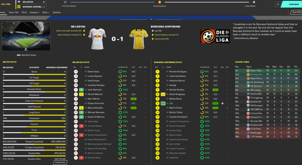 That little streak gave us the confidence to kick on and ease past Eintracht Frankfurt 3-1, before Bayern lost at Leipzig to extend our lead at the top to six points. Big-money summer signing Martin Flores had finally started to show signs of the form we’d expected, which was proven by him scoring and creating one in a 5-1 win at Heidenheim in which Strambelli bagged a brace and Jajá scored and created two.