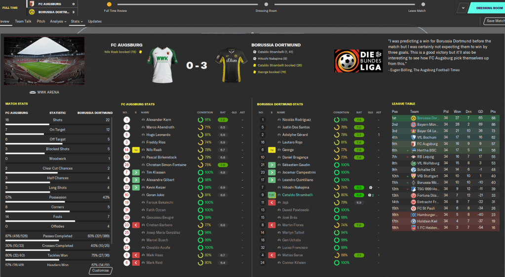 The final day of the season took us to Augsburg, and just so happened to my 800th game in football management. And the boys came up big with Strambelli settling any nerves by scoring inside 40 seconds, then Nakajima doubled the lead after 8 minutes. We were looking good going into half-time but Strambelli made it even better as he doubled his tally on 41 minutes.