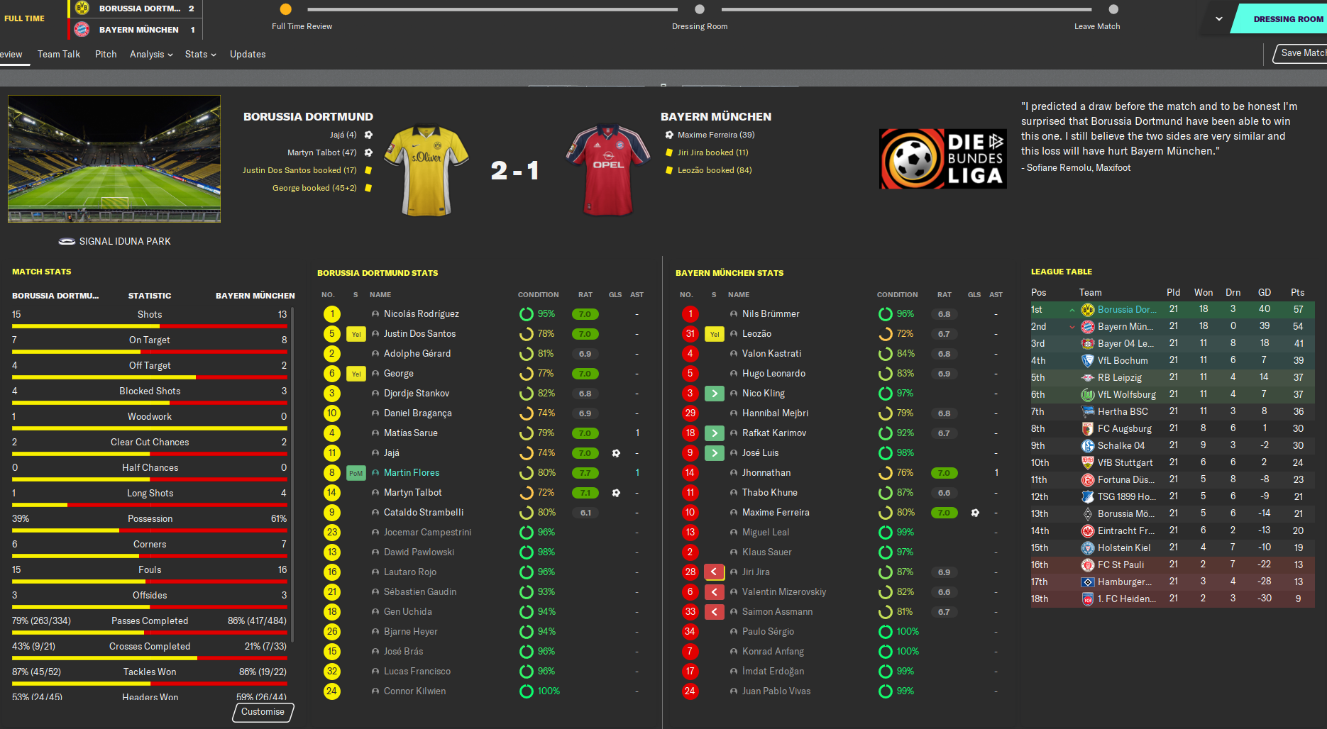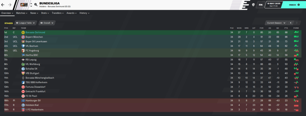 A quiet second half ensured we came home 3-0 winners to wrap up Dortmund’s second successive Bundesliga title! And this is my tenth league title as a manager in this save – six in Portugal, two in Spain and two in Germany.