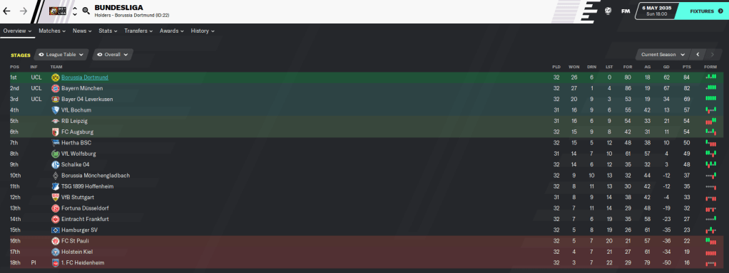 Leverkusen then came to town and took the lead on 15 minutes, only for Braganca to score an equaliser 6 minutes later. We kept pushing and Jajá put us in front on 65 minutes, but their wonderkid winger Andreas Achtstetter scored an 88th minute equaliser. However, Bochum came big for us and held Bayern 2-2 away, which took the fight to the final day.