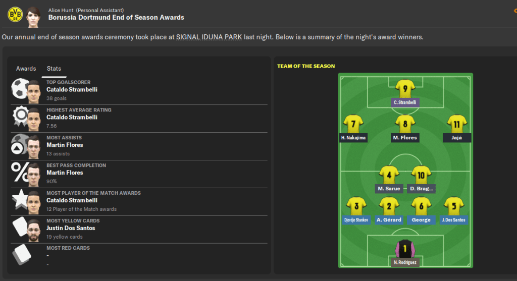 Strambelli unsurprisingly finished as the Bundesliga top scorer with 31 in 31. He averaged a goal every 89.30 minutes, had the most shots (156) and shots on target (98), and the most player of the match awards (10). He also claimed the highest average rating with a frankly ridiculous 7.75 in 31 matches.