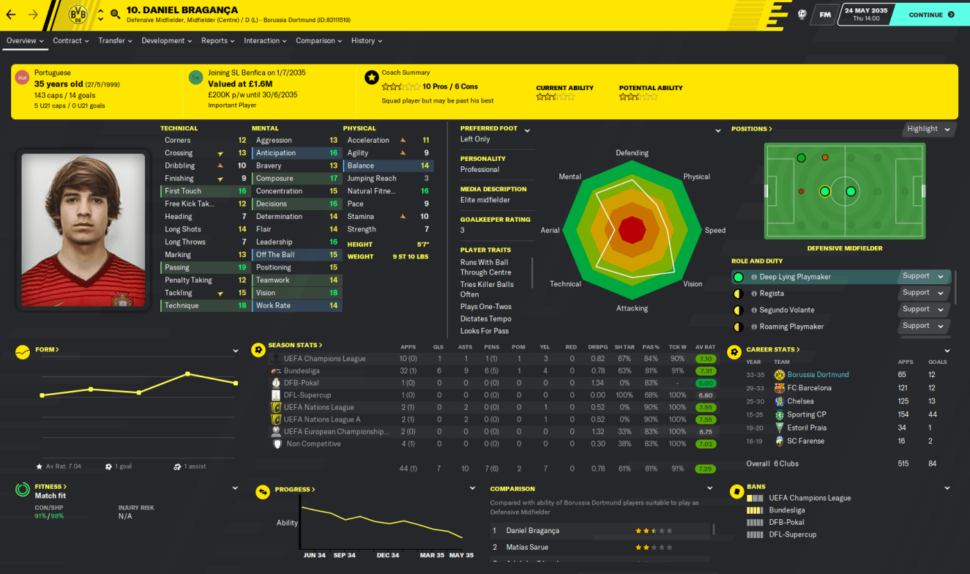Creativity wise, big-money signing Martin Flores led the way with 13 assists, followed by Jajá and Nakajima with 11. Legend of this save Daniel Braganca followed with 10, and he will not play another game for me after deciding to move to Benfica when his contract expires. I worked out that since we handed him his Sporting debut in 2020/21, he’s scored 56 goals and got 68 assists in 219 games for me with Sporting and Dortmund compared to 25 goals and 57 assists in 246 matches without me at Chelsea and Barcelona. And he captained both of the sides I managed him at. What a legend.