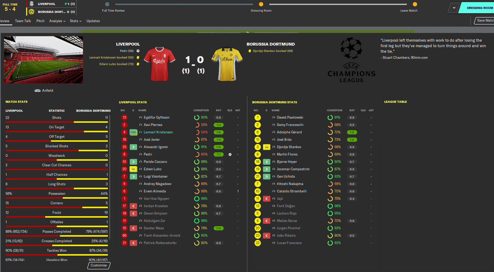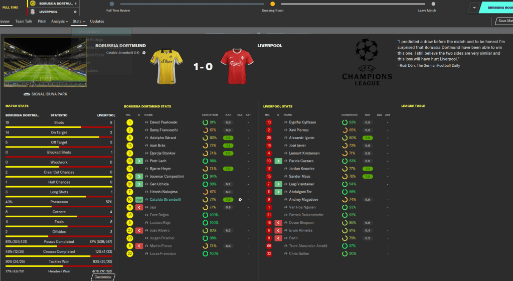 That took us to penalties, and youngster Heyer missed our third spot kick while Liverpool unsurprisingly scored all of theirs. And that’s the Champions League dream ended for another season – so close, yet so far!